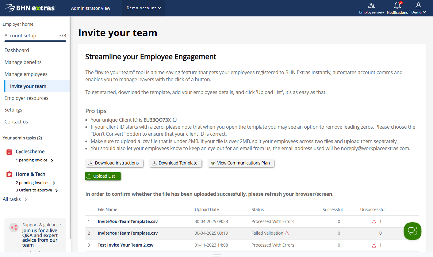 1. First download a template from the Invite your Team screen that includes all the necessary details for the file upload. The file should be in .csv format and under 2mb. Simply enter your employee’s details into the template and click on ‘Upload List’ to start the process.